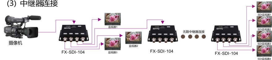 2)連接SDI信號(hào)裝置(e.g監(jiān)視器或視頻處理器)到SDI-104 輸出